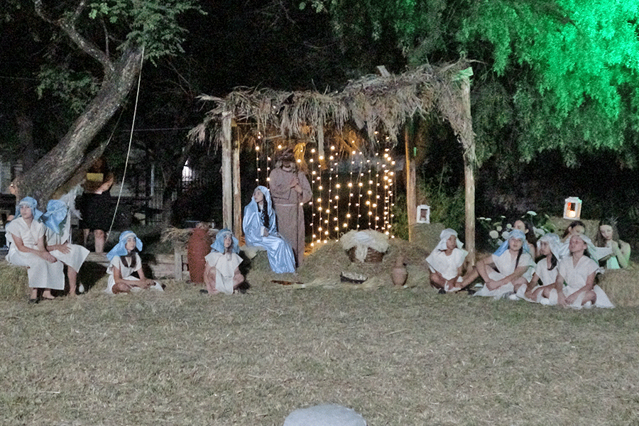 Ante una multitud ubicada cómodamente en el predio, especialmente preparado para la ocasión, se cumplió en primer lugar la presentación del Pesebre Viviente, a cargo de la Escuela Municipal de Danzas Clásicas, dirigida por la profesora Mary Loker.