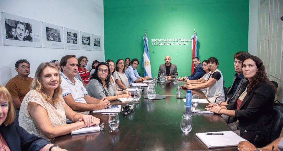 El encuentro fue encabezado por el secretario de Trabajo, Mariano Camoirano; el presidente del Consejo General de Educación (CGE), Carlos Cuenca y la secretaria de Hacienda, Mariela Volpe, junto a representantes gremiales.