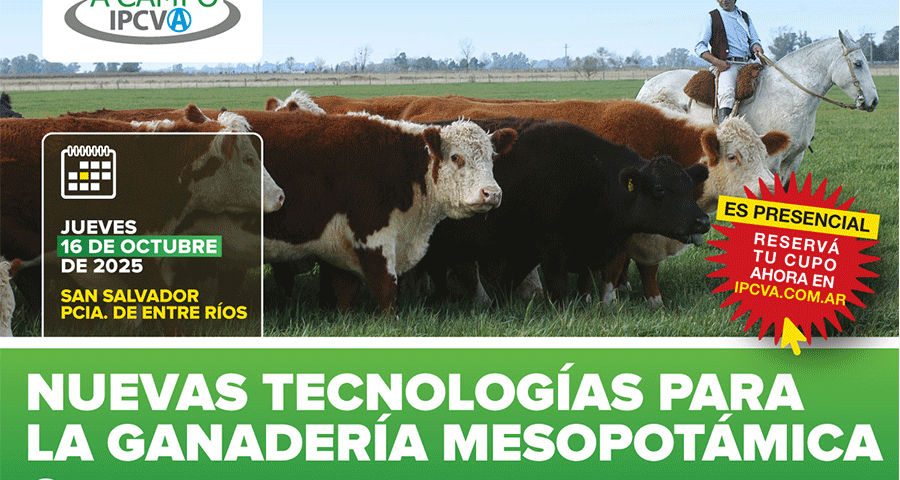 Bajo el slogan “Nuevas tecnologías para la ganadería mesopotámica”, el Instituto de Promoción de la Carne Vacuna Argentina (IPCVA) llevará a cabo una nueva Jornada a Campo en el Establecimiento La Lucrecia de San Salvador, Provincia de Entre Ríos (Acceso a Jubileo, Ruta Nacional 18 Km 190) el próximo jueves 16 de octubre de 2025.