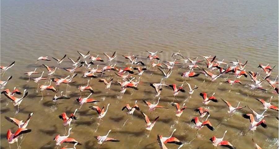 El avistaje de estos flamencos es frecuente sobre el humedal de Campo Andino. Como quedó sin agua por la sequía, los flamencos rosados volaron hasta la laguna Setúbal. La sequía hace que estos pájaros vuelen en busca de las lagunas cercanas.
