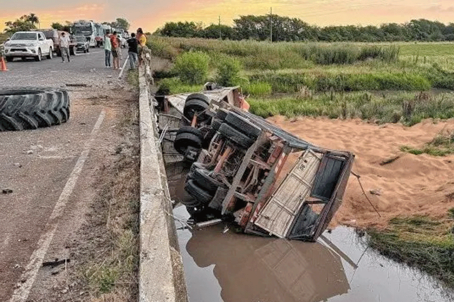 A raíz de la fuerza del impacto, el camión despistó, rompió la baranda de contención del puente y cayó al cauce del arroyo, volcando y desparramando la totalidad de su carga de granos. El vehículo quedó con daños significativos en la parte baja de la estructura.