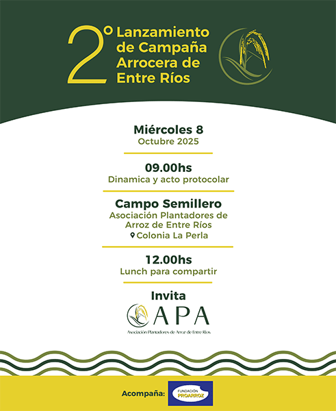 La Asociación Plantadores de Arroz de Entre Ríos llevará adelante este miércoles 8 de octubre el segundo lanzamiento de la campaña arrocera de Entre Ríos.