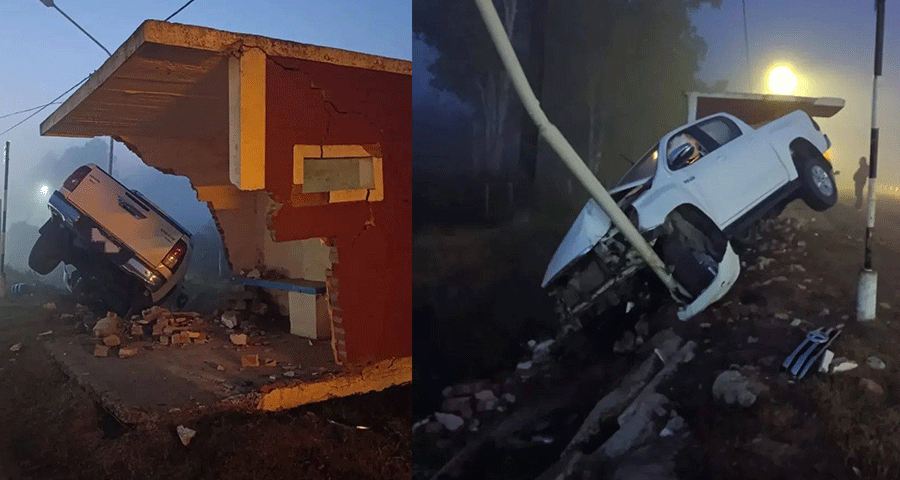 Personal de la Comisaría Los Charrúas se hizo presente en el lugar y constató los daños ocasionados por el impacto de una Toyota Hilux contra una garita de material y un poste de luminaria pública.