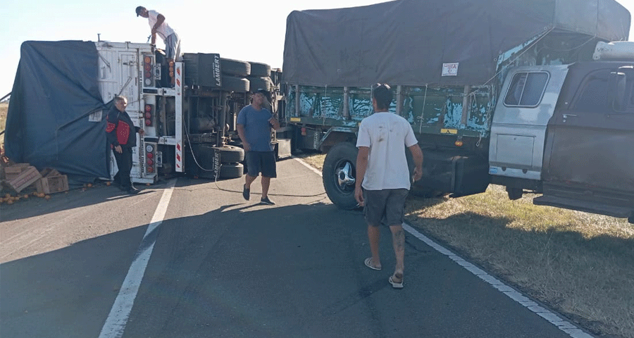 Alrededor de las 17:40 horas de este domingo, se registró el vuelco de un acoplado sobre la Ruta Nacional 18, en el acceso oeste a nuestra ciudad. Por razones que se tratan de establecer, el remolque cargado con cítricos volcó sobre la calzada, aunque el camión que lo traccionaba permaneció en pie.